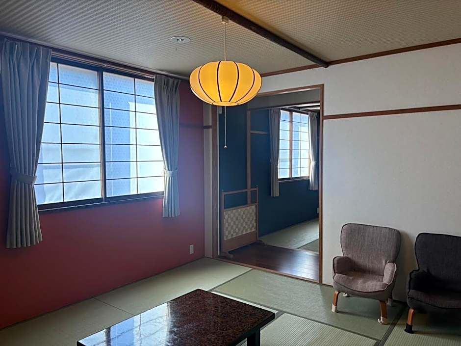 Room featuring a tatami (woven-straw) floor, a low table with seating cushions and Japanese futon bedding. Amenities include air conditioning, an LCD TV and yukata robes. Bathroom facilities and toilets are shared.